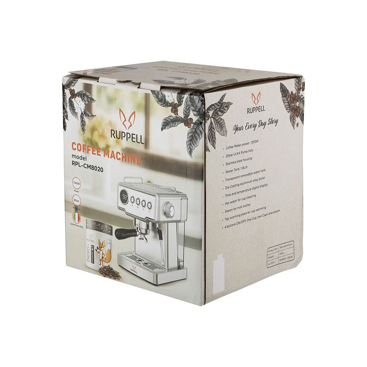 این اسپرسوساز مجهز به یک صفحه نمایش دیجیتالی برای نشاندادن دمای آب و زمان عصارهگیری، 4 عدد دکمهفشاری برای انتخاب دوز عصارهگیری، فعالسازی استیم وند و روشن و خاموشکردن دستگاه است. مخزن آب این دستگاه، حجمی معادل 1.8 لیتر داشته و از سینی روی این اسپرسوساز میتوان برای قراردادن فنجانها و گرمکردن آنها استفاده نمود. به همراه دستگاه اسپرسوی روپل مدل RPL-CM8020، یک عدد تمپر فلزی، یک عدد پیچر استیل 350 میلیلیتری و دفترچه راهنمای فارسی نیز عرضه میگردد.