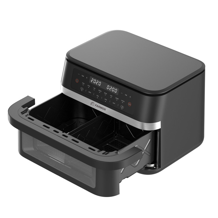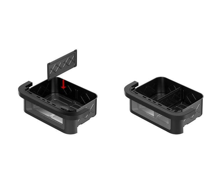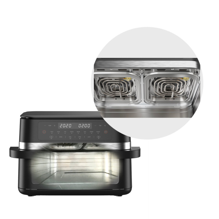 ویژگی بارز این سرخکن دوقلو، طراحی منحصربهفرد آن است. سبد این دستگاه هم میتواند بهصورت یکجا برای پخت غذاهایی که نیاز به حجم زیاد دارند استفاده شود و هم میتوان با قرار دادن صفحه جداکننده، سبد را به دو بخش تقسیم کرد. در این حالت میتوانید از هر طرف که مایل هستید استفاده کنید، طرف دیگر را خاموش نگه دارید یا بهطور همزمان برای تهیه دو غذای متفاوت از هر دو سبد استفاده کنید. تنظیمات هر سبد بهصورت جداگانه انجام میشود.